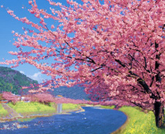 河津桜は緋寒桜と早咲き大島桜の自然交配種といわれ、開花が早いのが特徴です。1月下旬からつぼみがほころびはじめ3月初旬まで濃いピンク色の花を咲かせます。 まだ肌寒い時期にお花見がいち早く楽しめる河津桜まつりは毎年2月上旬から約1ヶ月間開催され、1ヶ月で100万人もの人出で賑わう河津の一大イベントです。夜にはライトアップされた桜並木を見ることができとても幻想的です