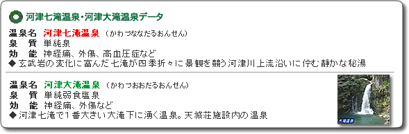 河津七滝温泉、大滝温泉は伊豆の天城山ふもと河津町の河津川上流の渓谷に佇む静かな 温泉街。河津では滝のことを「水が垂れる」 という意味で垂水(たるみ)と呼んでいたた「 ななたき 」ではなく「 ななだる 」と 呼んでいます。河津七滝温泉には温泉の他に川端康成著「伊豆の踊り子」の舞台でも有名で 七つの雄大な滝の他、旧天城トンネル等見所が沢山ある観光地でもあります。また近年では1月下旬より3月上旬にピンク色に咲き誇る「河津桜まつり」も開催され多くのお花見客でにぎわいます。春はバラと菖蒲、夏は海、秋は紅葉、冬は河津桜・・・と通年遊べる観光地です